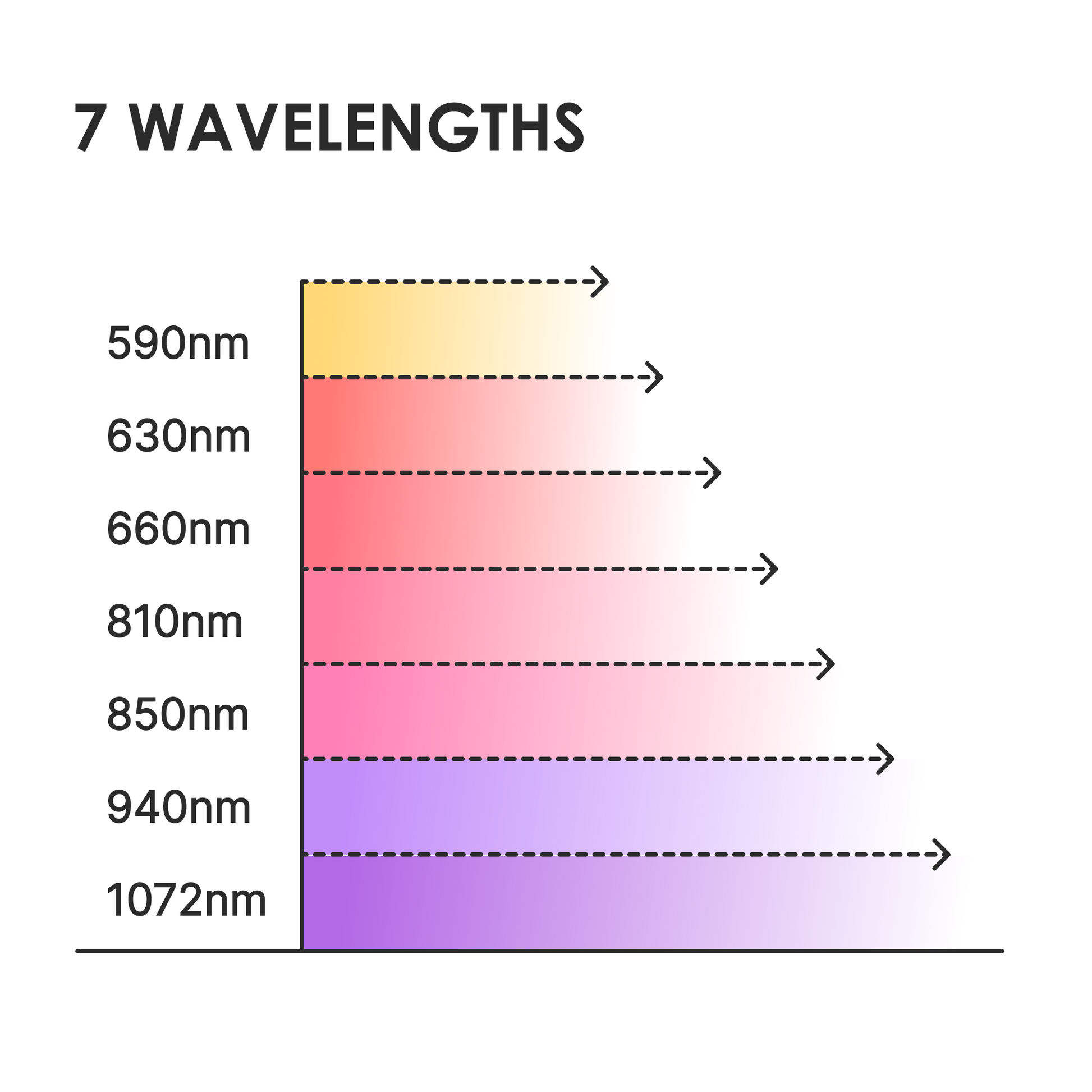 1072nm reaches the deepest tissues and promotes brain function as well as skin renewal, cell energy and overall regeneration.