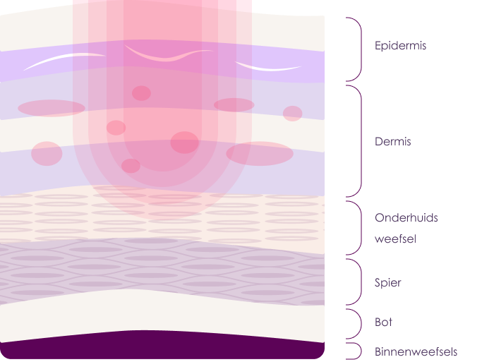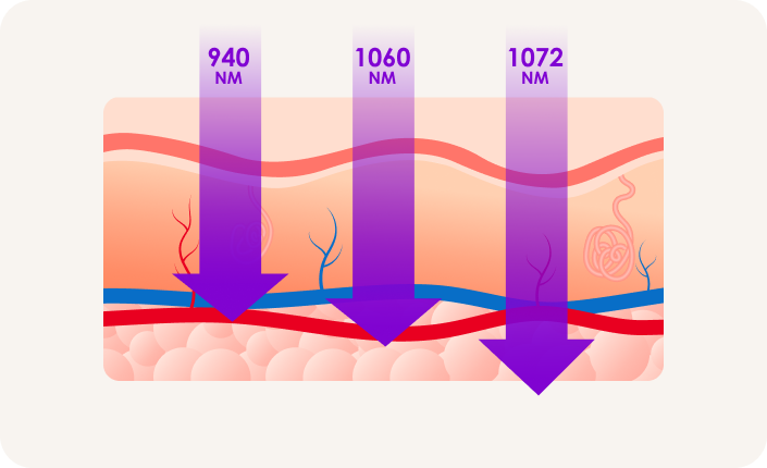 1060nm stimulates metabolism, accelerates regeneration and strengthens bone and cartilage structures, while also being effective for fat reduction by heating fat cells deep in the skin.
